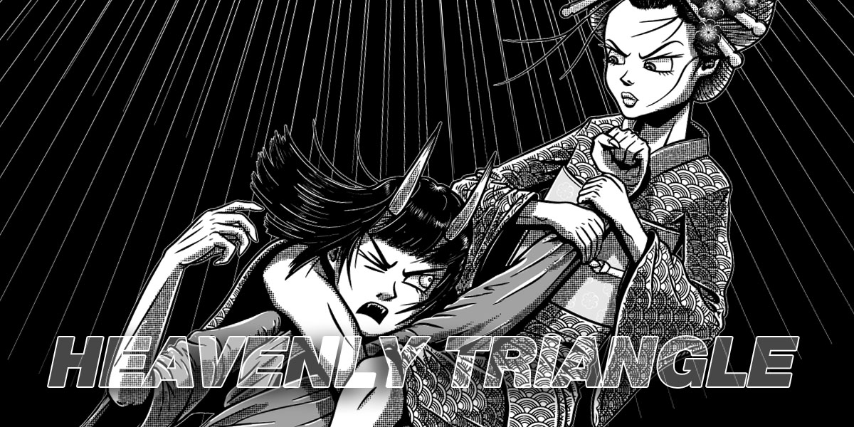 My newest drop has just gone live – a long sleeve rashguard and combination grappling shorts featuring my Heavenly Triangle artwork, drawn in the style of manga print comics.